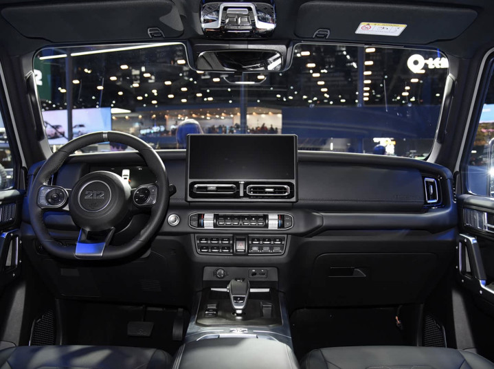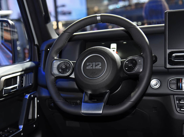 外观设计上,新车延续212系列标志性复古风格,前脸采用经典圆形大灯搭配标志性防空灯,方正轮廓与短小前悬设计,赋予 40 度超大接近角,为复杂路况通行奠定基础。车身尺寸上,其长宽高分别为4705*1895*1936毫米,轴距2860毫米,在保证硬朗造型的同时,为车内提供充裕空间