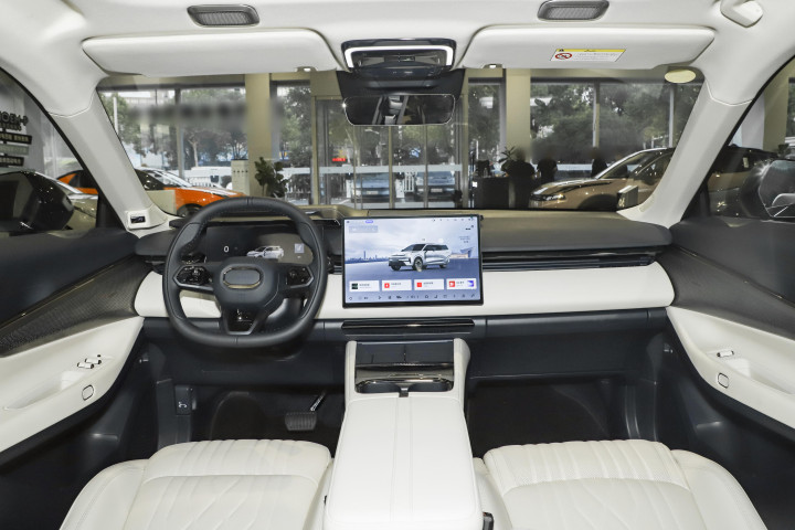 打开车门,领克08 EM-P的内饰还是挺上档次的。中控台采用分层式设计,大面积使用软性材质、金属拉丝饰板、环保皮革等进行搭配,做工细腻,触感柔和。几乎无物理按键的极简布局,将大多数功能集成于中控大屏,看上去非常清爽。